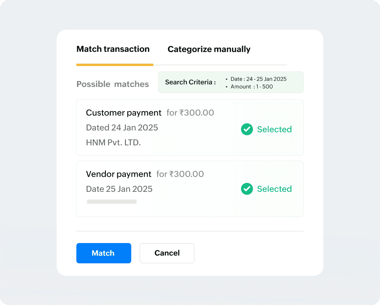 Received or made consolidated payments? Handling partial payments or installments? Fret not! Zoho Books lets you easily match multiple line items from both the bank feed and the transactions in Zoho Books.